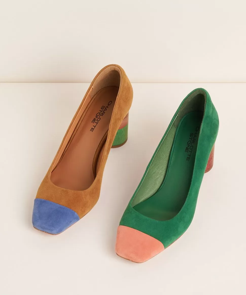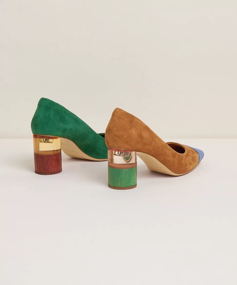 A Bold, Stacked Heel Rich With Mismatch Colorblocking. Dyed Wood And Color Blocked Resin Heels, Vibrant Suede Uppers, Co…