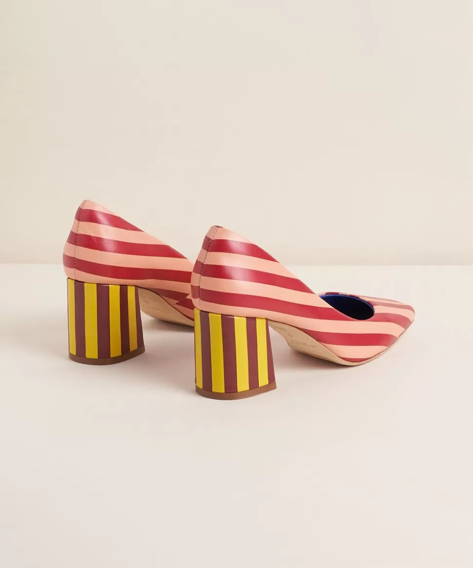 A Heritage Pump Style That Is Equal Parts Classy And Novelty. Multi-Mismatch Striped Leather Uppers With Contrasting Striped 2.75″ Block Heels, Squared Toe, And Dressy Buffed Leather Outsoles. With Stripes Like These You Know We Toe The Line Of Seriously Fun. ?