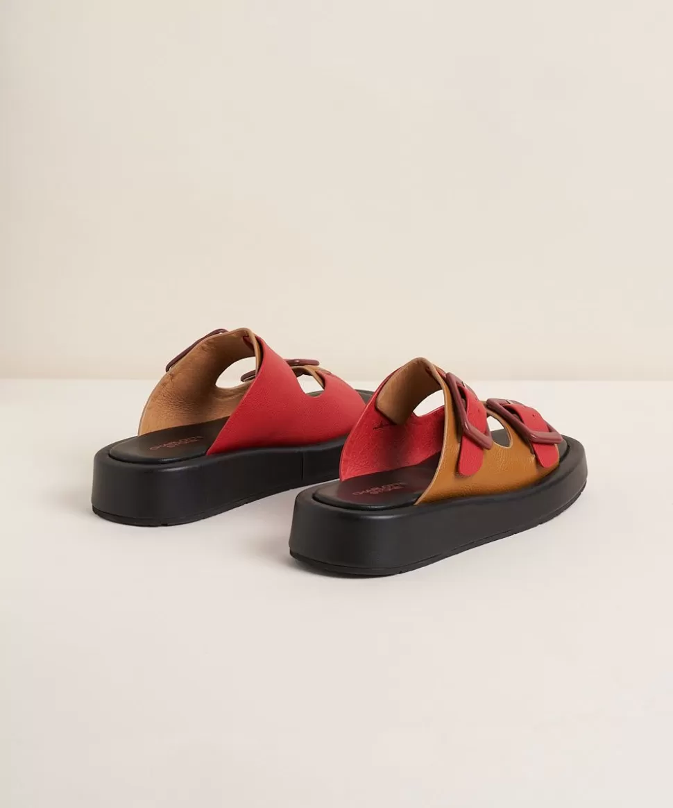 A New Flatform Sandal In Two Multi Colorways. All Leather Uppers In Contrasting Colors With Covered Fully Adjustable Buc…